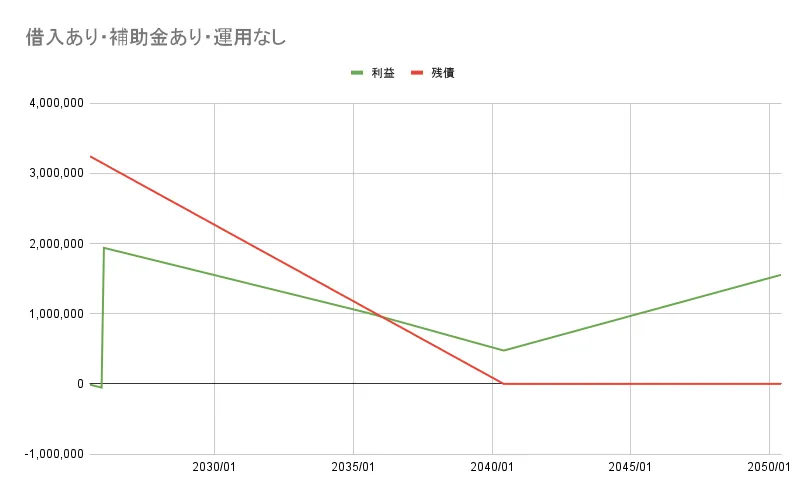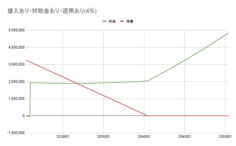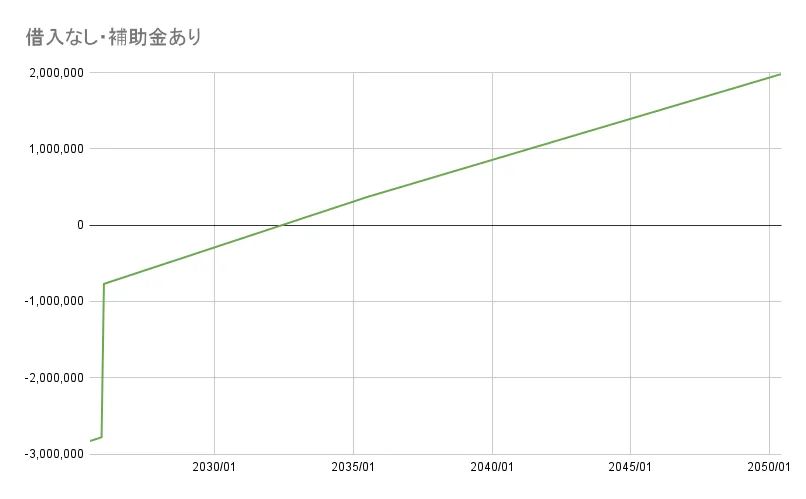 最初の半年間は補助金が入ってこないので少し赤字を掘りますが、補助金が入ってからは2040年5月の完済まで、赤字が出ることはありません。